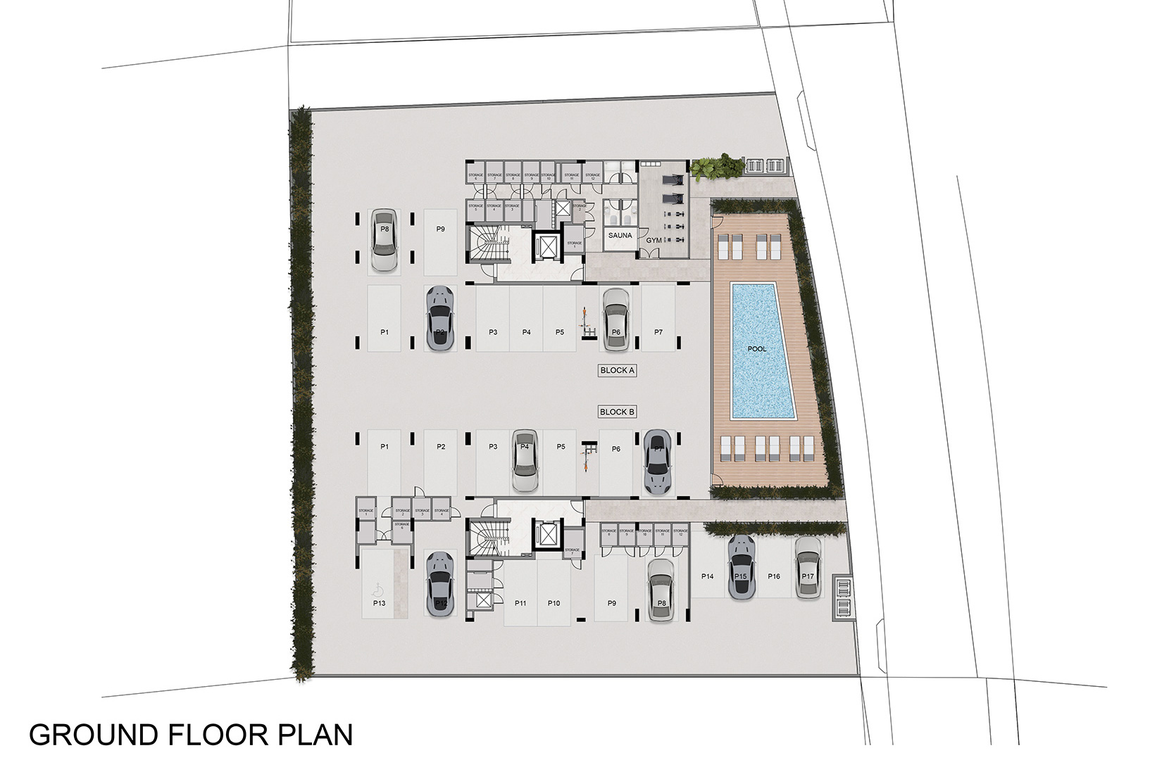 The beautifully landscaped communal garden and luxury pool provide a perfect retreat for residents, offering a sense of exclusivity and relaxation. Penthouses feature private roof gardens with Mediterranean sea views and their own private pools, elevating the living experience to the highest standard.